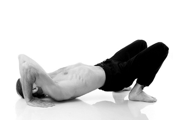 Ноги согнуты в коленях, подошвы стоят на полу. Согнутые в локтях руки опираются ладонями в пол по сторонам от головы.