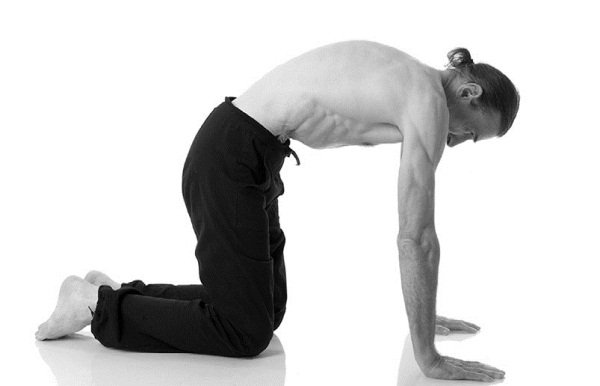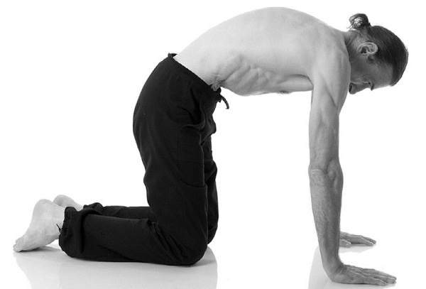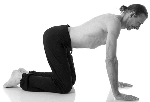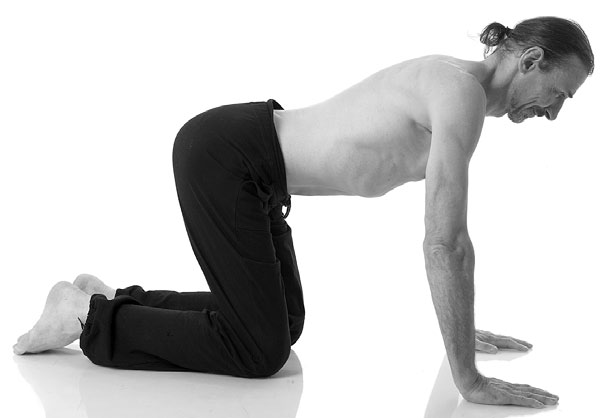Независимо оттого, получилось у вас предыдущее упражнение или нет, выполните его на четвереньках. Опуститесь на пол, колени касаются друг друга, руки параллельны, пальцы обращены вперед, голова опущена, живот расслаблен.