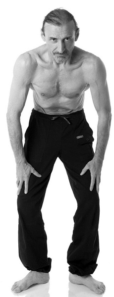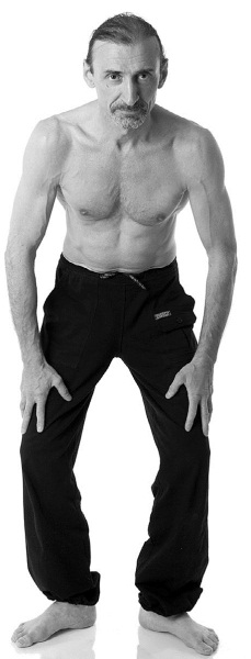 Встаньте, расставив ноги (носки врозь), туловище слегка наклоните вперед и обопритесь ладонями о слегка согнутые колени. Начните выпускать из легких воздух, глубоко выдохнув через нос и втянув живот. Очень важно понять, что овладеть подъемами живота можно, если весь воздух выдыхается из легких и его поступление в легкие не допускается в течение всего упражнения. Поэтому требуется терпеливая отработка глубокого выдоха, за которым следуют восходящие движения животом.