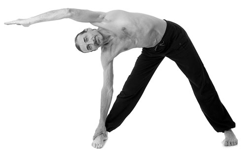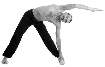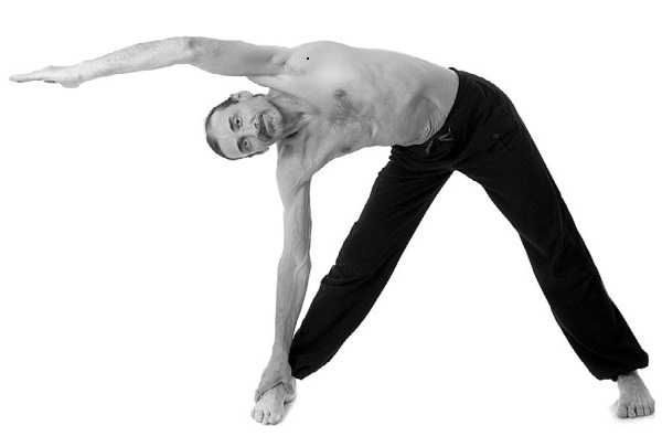 позу треугольника – наклоны влево и вправо из положения стоя, без сгибания локтей и коленей;