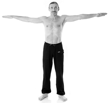 Во время очередного вдоха плавно поднимите руки в стороны до горизонтали ладонями вниз.