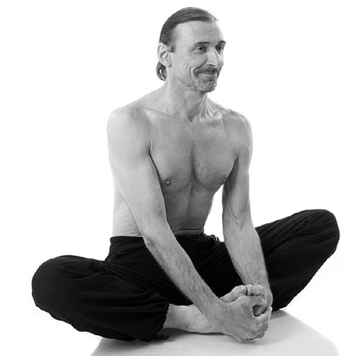 Сядьте на коврик, соединив стопы и разведя колени в стороны. Спина прямая, голову не опускайте и не запрокидывайте назад. Обхватите руками стопы и максимально приблизьте их к области паха. Сосредоточьтесь на ощущениях в теле, максимально расслабьте мышцы.
