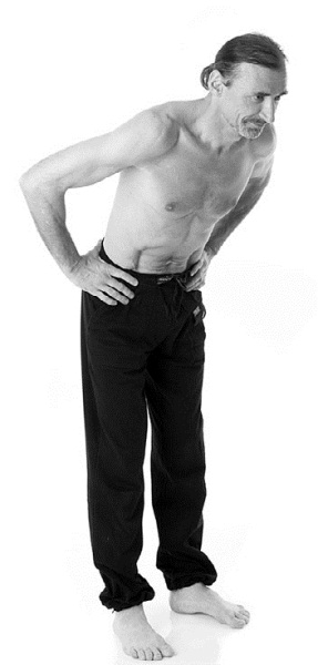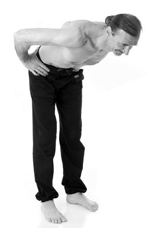 Встаньте прямо, спина прямая, пятки вместе, подбородок чуть приподнят, взгляд устремлен вперед. Положите руки на бедра. Медленно наклонитесь вперед на комфортный для вас угол.
