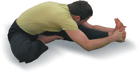 Теперь опустите голову к ногам и по возможности обхватите руками верхнюю часть стоп, потягивая носки на себя еще больше. (рис. 35)