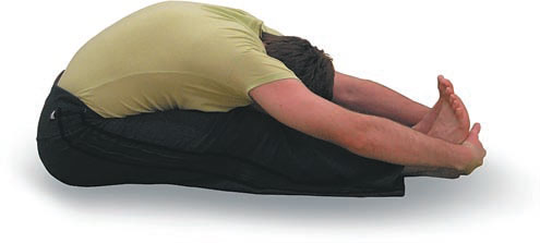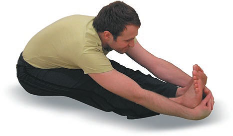 Если вам тяже ло обхватить руками стопы, сохраняя ноги прямыми, можете согнуть ноги в коленях настолько, насколько это необходимо. Затем начните понемногу выпрямлять ноги, не перенапрягаясь. Дыханием помогайте расслаблять связки ног. Не тяните голову к ногам, пусть макушка тянется вперед, вдоль ног, а живот и грудная клетка – к ногам. Удерживайте положение около 20 секунд.