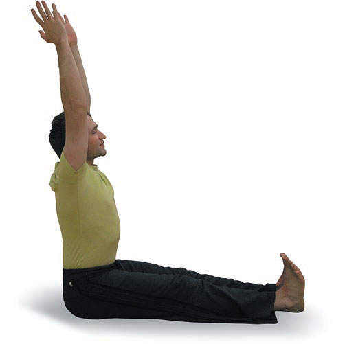Асана 7. «Прямой угол» из положения сидя (дандасана)Описание. Исходное положение такое же, как в предыдущей асане. Выпрямите ноги, соедините их, потяните носки на себя и вверх, выпрямите спину. Руками отведите ягодицы немного в стороны и устройтесь удобно. На вдохе поднимите руки через стороны вертикально. Вертикальность положения рук можно легко проверить: предплечья должны касаться ушей. Не нужно высоко поднимать плечи. Выпрямите ладони, соедините пальцы рук. Вытягивайтесь позвоночником вверх перпендикулярно полу. Ноги остаются выпрямленными на полу. Между корпусом и ногами должен образоваться прямой угол. Стремитесь удерживать положение за счет мышц спины и ног и расслабить живот. Сохраняйте положение во время нескольких дыхательных циклов, на выдохе плавно опустите руки через стороны вниз. (рис. 36)