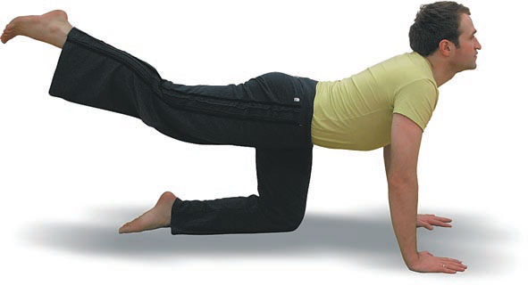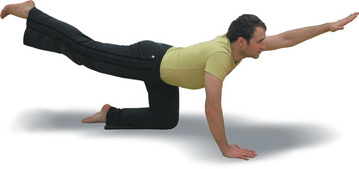 Выпрямите спину, снова прогнитесь (смотрите вперед, а спину прогибайте вниз) и поменяйте ногу и руку.