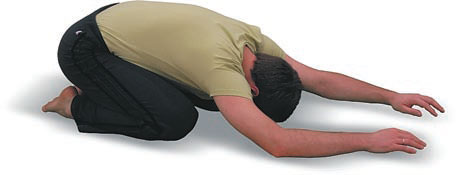 Находитесь в этом положении до тех пор, пока не почувствуете расслабление в спине и во всем теле. Продолжайте дышать свободно. Поднимайтесь плавно, выпрямляя позвонок за позвонком снизу вверх (голова выпрямится в последнюю очередь), и сядьте на пятки.