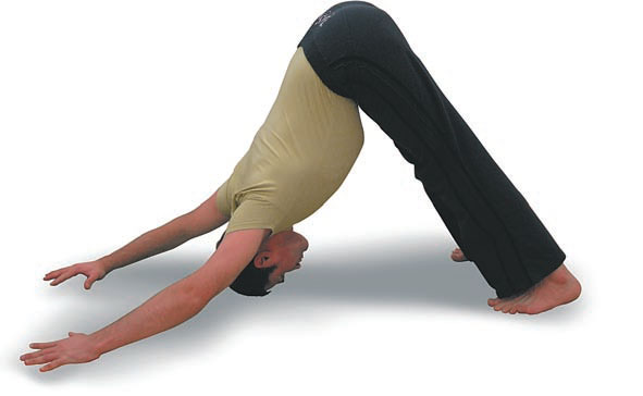 Этап 2 Асана 1. «Собака» (адхо мукха шванасана)Описание. Находясь в позе «ребенок», выпрямите руки вперед и упритесь ладонями в пол (коврик) так, чтобы руки не скользили. Широко разведите пальцы рук. Потяните носки на себя и упритесь верхней частью стопы (носками) в пол или коврик, чтобы ноги не скользили. Разведите ноги так, чтобы расстояние между стопами оказалось равным ширине плеч.