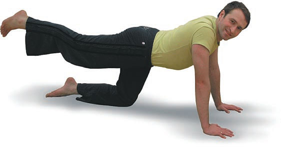 Если вам сначала тяжело сразу перейти в это положение из предыдущего, не опуская ногу, можете вначале перейти в обычную позу «палка» из поз «ребенок» или «собака» и затем поднять ногу. Если вам тяжело удерживать ногу прямой на весу, можете разделить выполнение на несколько подходов. Если тяжело удерживать корпус и ноги прямыми, можно опустить левое колено на пол, затем выпрямить и удержать несколько секунд, а потом повторить, удерживая положение немного дольше. Постепенно, по мере укрепления мышц спины и ног, вам удастся удерживать эту позу от 20 до 30 секунд.(рис. 54)