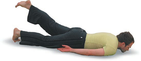 Нога прямая и поднята в колене. Лучше поднять ее не слишком высоко, но все же сохранить прямой. Не отрывайте голову от пола, не напрягайте плечи. Удерживайте положение от 10 до 20 секунд. Опустите правую ногу и поднимите левую. Опустите ногу и расслабьтесь на несколько секунд.