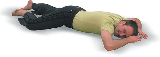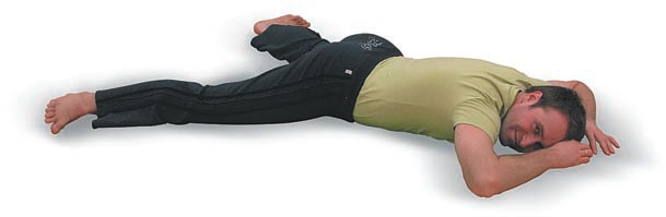 Описание. Лягте на живот, соедините ноги вместе, выпрямите голеностоп параллельно полу, боковая и внутренняя стороны стоп соприкасаются, голову опустите лбом к полу, руки вытяните вдоль ног ладонями кверху, плечи опустите к полу.