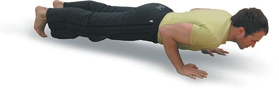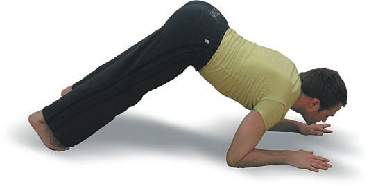 Асана 11. Отжимание от пола (динамичный вариант) Описание. Исходное положение – поза «палка». Сделайте от 3 до 6 отжиманий от пола. При последнем отжимании опустите таз ниже и перейдите в следующую асану.Если вам тяжело делать отжимания с прямым корпусом, можете начать с более простого варианта, а затем вернуться к описанному выше. Согните ноги в коленях, сцепите верхнюю часть стоп и делайте отжимания на руках с опущенными на пол коленями; при отжимании подтягивайте стопы к ягодицам. После этого упражнения вы также можете отдохнуть в позе «ребенок» и затем лечь на живот.
