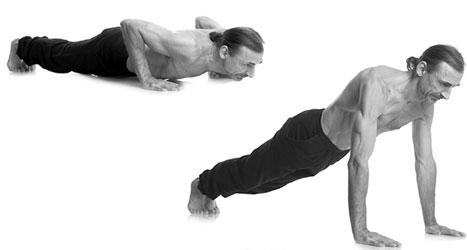 Очень важно, чтобы во время выполнения асаны ваше тело было одной прямой линией от макушки до пяток. Ни в коем случае нельзя поднимать ягодицы и опускать грудную клетку ниже уровня локтей. Если вам сложно удерживать равновесие, на первых порах вы можете опираться не на ладони, а на локти, сложив при этом ладони в замок и вытянув тело в прямую. Еще один вариант облегчения — опираться на согнутые колени. Тело при этом тоже должно быть максимально прямым.