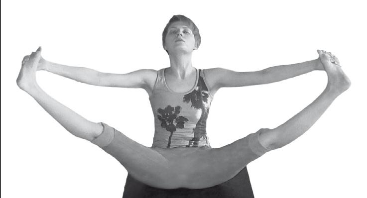 2 Поднимаем левую ногу вверх и подтягиваемся вперед. Взгляд на большой палец левой ноги.