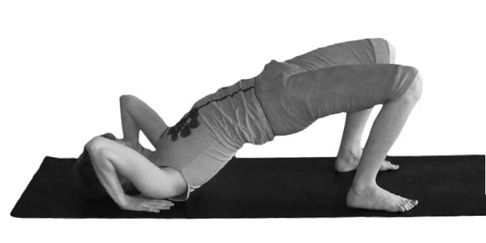 4 Подтягивая живот (Уддияна Бандха) и запирая сфинктеры прямой кишки (Мула Бандха), мощно отталкиваемся ногами и руками от пола, приходя в мостик. Взгляд на кончик носа.