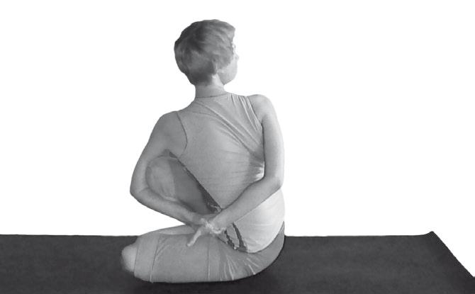 3 Соединяем руки за спиной, захватив правое бедро. Взгляд в сторону, подбородок над правым плечом.