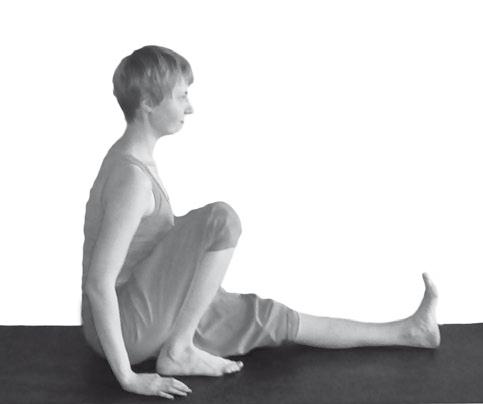 1 Исходное положение – сидя на коврике. Левая нога вытянута вперед, правая, согнутая в колене, нога подтянута к ягодице.