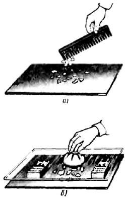Рис. 1. Наэлектризованная расческа притягивает пушинки, волоски, кусочки бумаги (а); под электризующимся стеклом кусочки бумаги «танцуют» (б)