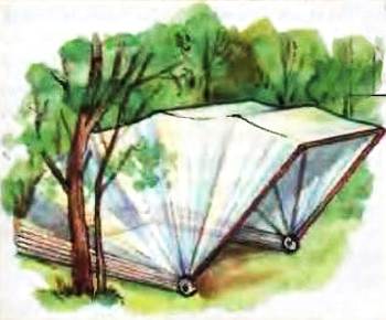 Вдоль всей кромки по переднему краю тента нужно прошить карман. В него вставляется первая, наружная, дуга. Остальные дуги крепятся к тенту завязками или проволочными скобками. Нижняя дуга — основание — прижимается к грунту проволочными шпильками или колышками — вот и вся конструкция.