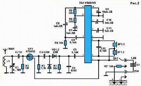 Прием в диапазонах длинных или средних волн ведется на магнитную антенну WA1, сигнал которой поступает на затвор полевого транзистора VT1. Сигнал с его истока детектирует диоды VD1, VD2