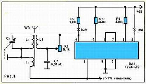 Работает приставка в средневолновом диапазоне. Ночью, напомним, на средних волнах можно поймать весьма удаленные станции. На схеме: элементы WA, Ск, Lк — магнитная антенна с контурной катушкой и секция блока конденсаторов переменной емкости, уже имеющиеся в конструкции приемника; Lс — штатная катушка связи входного контура со смесителем преобразователя или с каскадом усиления радиочастоты. Вновь вводимый узел содержит микросхему DA1, несколько навесных деталей и катушку обратной связи L1, надеваемую на стержень магнитной антенны рядом с катушкой Lк. Первый каскад DA1 включен по схеме эмиттерного повторителя, благодаря чему имеет высокое входное сопротивление; будучи присоединен выводом 6 к цепи катушки Lc, он практически не создает дополнительной нагрузки на входной контур Lк, Ск. С выхода эмиттерного повторителя сигнал поступает на второй, также «спрятанный» в микросхеме, каскад усиления; с его коллекторной нагрузки R2 снимается значительно усиленный сигнал, поступающий в катушку обратной связи L1. При правильном положении последней ее магнитный поток усиливает поток от катушки Lк, что равносильно снижению потерь в контуре. Благодаря увеличению добротности контура, принятый сигнал воспроизводится громче, снижаются или пропадают вовсе помехи от сигналов радиостанций, работающих на близких частотах. Но если обратная связь излишне велика, приемник самовозбуждается.