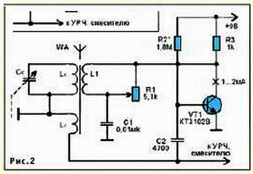 Со схемой приемника наша регенерирующая приставка связана в трех доступных точках — с «общим проводом», цепью питания и цепью катушки Lc. Указанные на схеме величины токов микросхемы можно подогнать при необходимости подбором номиналов резисторов R3, R4. Перемещая катушку L1 относительно Lк и уточняя число витков L1, нетрудно добиться возникновения генерации на всем принимаемом диапазоне. Может случиться, что у вас нет нужной микросхемы или для нее не удается найти места вблизи магнитной антенны. Тогда приставку можно выполнить согласно схеме, показанной на рисунке 2.