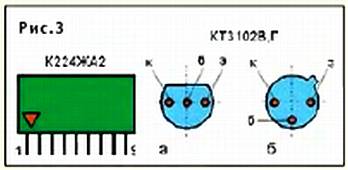 для повышения входного сопротивления усилительного каскада на транзисторе VT1 использован транзистор с высоким коэффициентом передачи тока, типа КТ3102В либо Г. Его режим по постоянному току обеспечивается подбором резистора R2. На рисунке 3 дано расположение выводов используемых полупроводниковых приборов; позиции «а», «б» отвечают разным исполнениям корпусов транзистора КТ3102.Ю. ПРОКОПЦЕВ
