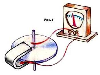 В 1831 году известный физик Майкл Фарадей поставил опыт, о котором помнит сегодня далеко не каждый учитель физики. Между полюсами магнита он поместил вращающийся металлический диск. Одна проволока прикасалась к оси вращения диска, другая — к его ободу. Присоединенный к этим щеткам гальванометр показал наличие тока (рис. 1).