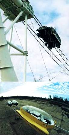 3. Первые испытания струнного транспорта Э.Юницкого успешно прошли в подмосковных Озерах. Суть его в том, что транспортный модуль (а это на первых порах переделанный на реборды серийный грузовик ЗИЛ-131) движется, как по струне, по монорельсу, натянутому между опорами. Преимущества особенно очевидны в местах труднодоступных: в горах через ущелья, через реки и болота, в карьерах. Скоростные надземные магистрали разгрузили бы и города, задыхающиеся в автомобильных пробках.