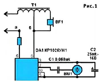 Используя микросхему КР1026, вам нет необходимости разбираться в полярности ее присоединения к трубке: стоящий за выводами 6, 8мостовой выпрямитель подает питание на усилитель всегда правильно. Немногие внешние детали можно взять следующих типов: резистор R1 — МЛТ-0,5, конденсаторы С1 — КЛС, С2 — К53-1.
