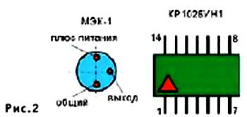 Как видим, здесь требуется введение в цепь питания внешнего токоограничивающего резистора R2. Он присоединяется к выводу стока полевого транзистора, спрятанного в корпусе микрофона. Соответственно электрический сигнал микрофона берется не со специального вывода, который тут отсутствует, а с точки соединения указанного вывода стока и резистора R2. Чтобы разобраться в выводах микрофона, обратим внимание на форму концов: «стоковый» вывод, связанный с «плюсом» питания (вывод 3микросхемы DA1), имеет тупой вид, вывод же истока транзистора, присоединяемый к «минусовой» цепи (выводы 5, 10микросхемы), скошенный, заостренный.