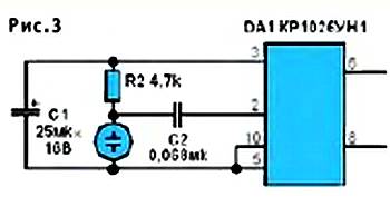 Вполне вероятно, что для вас более доступными окажутся электретные микрофоны, имеющие не три, а два вывода, например, типа МКЭ-389. Микрофон такого исполнения включается несколько иначе (см. рис. 3).