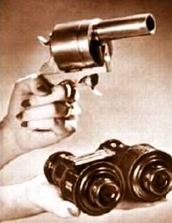 Фотография появилась в 1839 году. Чувствительность первых фотопластинок была столь низка, что голову человека при съемке портрета приходилось фиксировать тисками. Но уже к 1870 году чувствительность фотоэмульсий возросла в тысячу раз. Стало возможным снимать даже идущего человека. Вот тогда для фотографии и нашлось деликатное применение — скрытный, секретный сбор информации. Известно об этом мало. Нормальный фотоаппарат XIX века был размером с аккордеон. И конечно, его пришлось уменьшать и придавать ему невинный вид. Вот, к примеру, камера в виде револьвера (рис. 1).
