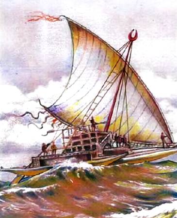 Полинезийский «парусный крейсер», вмещавший десятки людей с припасами, домашней птицей и земляной печью.