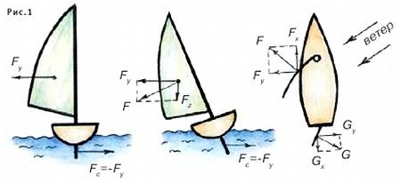 Появляется новая составляющая силы Fz, направленная от паруса вниз и еще больше прижимающая его к воде. Сила Fxтакже смещается от осевой линии яхты влево и «приводит» яхту к ветру. Чтобы противодействовать этому, приходится отклонять руль (говорят, что яхта «лежит на руле»). На руле возникает сила G, которая также раскладывается на две: Gy, которая поворачивает яхту, и Gx, которая тормозит ее.