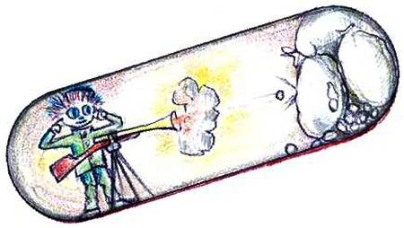 тут огромный простор фантазии! Но… Не спешите.Простейший расчет показывает, а эксперимент подтверждает, что аппарат работать не будет. Сразу после выстрела он рванется в противоположную сторону, но тотчас остановится, как только пуля застрянет в песке.