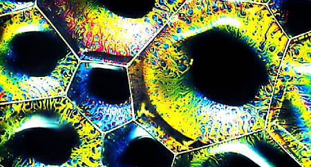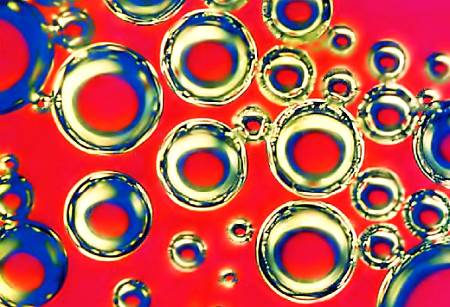 Добравшись до поверхности, такой пузырек тут же окутывается мыльной пленкой. А когда рядом появляется сосед, то тут же стремится прижаться к нему, постепенно образуя некую сотовую структуру. Вот это и есть простейший пузырьковый кристалл.