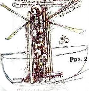 Стенд был сделан в 1483–1486 гг. На нем измерялась подъемная сила крыла, испытывалась его прочность, подбирались материалы, изучались возможности человеческих сил. Через десять лет такой работы Леонардо отказался от своею первого проекта летательной машины, где человек лежит, приводя в действие руками ногами пару крыльев простейшей конструкции. В новом аппарате (рис. 2) человек уже стоит, работая всеми мышцами своего тела, а крыло напоминает крыло птицы — «…при подъеме оказывается везде сквозным, а при опускании цельным».
