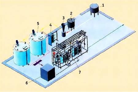 Цифрами обозначены: 1— плавитель жира; 2— емкость для сгущенного молока; 3— диспергатор; 4— подогреватель; 5— емкости для смешивания; 6— гомогенизатор; 7— пастеризатор.