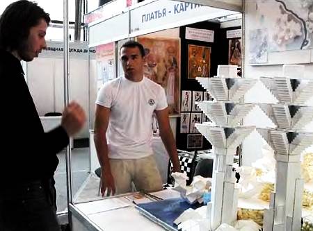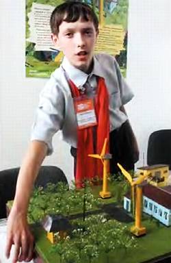 Евгений Тарусовиз г. Озерск Челябинской области привез в Москву макет станции экологического мониторинга с ветрогенераторами, позволяющими снабдить каждую лабораторию энергией за счет сил ветра и солнечного света.