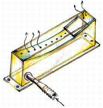 Положите на ровный стол сверло диаметром 6 мм, а сверху при помощи двух грузиков по концам прижмите узкую линейку. Она изогнется по дуге радиусом примерно 20 м. По бокам прижмите к ней две другие широкие линейки и в углах подпустите клей. У вас получилась открытая коробка с вогнутой стенкой. Приклейте к ней еще три кусочка оргстекла, как указано на рисунке, до получения замкнутого объема. В один из этих кусочков в торце коробки заранее вклейте патрубок, чтобы подключить шланг компрессора.
