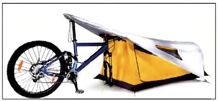 ПАЛАТКУ ДЛЯ ВЕЛОСИПЕДИСТОВсоздали специалисты американской фирмы Topeak. В отличие от обычных палаток, она использует в качестве опоры часть конструкции самого велосипеда (см. фото). В сложенном же виде палатка занимает не больше места, чем обычный термос.
