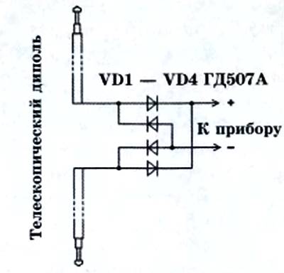 Такой детектор не нарушает симметричности диполя, не требует дополнительных деталей (дросселей, трансформаторов), даже блокировочный конденсатор, обычно включаемый параллельно выходу детектора, ему не особенно нужен. Как показал опыт, подключение конденсатора дает увеличение показаний всего на несколько процентов. Кроме того, мост, в отличие от обычного детектора на одном диоде, использует обе полуволны переменного высокочастотного сигнала, следовательно, если можно так пошутить, симметричен не только в пространстве, но и во времени.