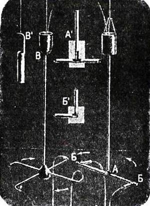 Центральная соломинка пропущена через широкую пробку-поплавок. На этой соломинке укреплена другая, горизонтальная, такой же толщины, но закрытая с обоих концов. В горизонтальной соломинке сделана дырка, которая приходится как раз над отверстием вертикальной соломинки. Соломинки, отходящие книзу от горизонтальной — потоньше. Их отверстия тоже соединены с горизонтальной соломинкой. К нижним концам тонких соломинок пластилином прилеплены ответвления, направленные в противоположные стороны. Все другие скрепления тоже сделаны при помощи пластилина. Можно скрепить соломинки иначе, воткнув их концы в просверленные кусочки пробки (А 1, Б 1).