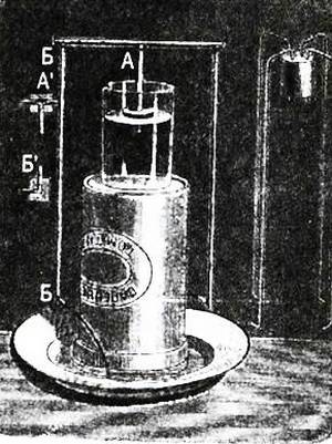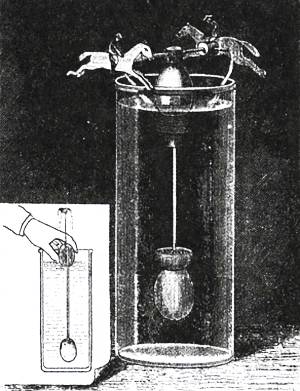 Для того чтобы повторить опыт, нужно перевернуть аппарат, прикрыв пальцем отверстие нижнего яйца и картонным кружочком чашечку с грузом. Верхнее яйцо опять наполнится водой, и вернувшийся в обычное положение аппарат тотчас же начнет работать.