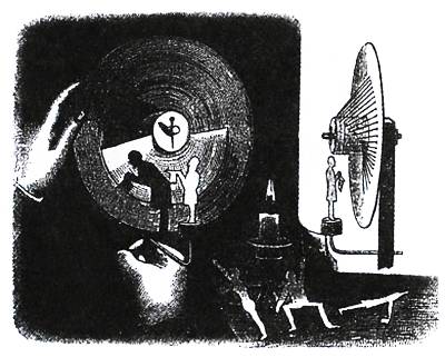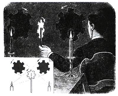Держите диск перед свечой и вращайте его. Тень, падающая от фигурки, тотчас же начнет кланяться. Когда тень оказывается на плоской поверхности круга, теневая фигурка неподвижна. Но как только тень упадет на спиральную поверхность, теневая фигурка отвесит быстрый поклон. С каждым поворотом диска — новый поклон. А ведь картонная фигурка все время спокойно стоит на месте…