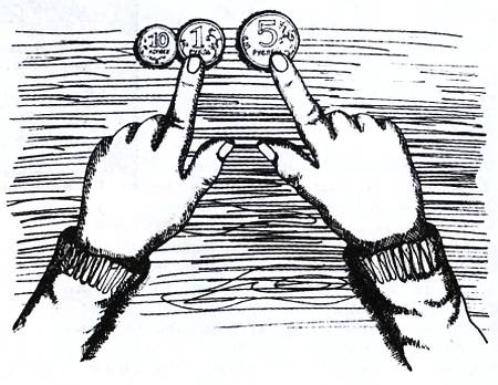 Положите рублевую монету на стол. Прижмите ее указательным пальцем левой руки к поверхности стола. С левой стороны вплотную к рублю поместите монетку в 10 копеек. С правой стороны на некотором расстоянии от рубля положите пятирублевую монету. Теперь указательным пальцем правой руки подтолкните 5 рублей к рублю так, чтобы монетки стукнулись друг о друга.