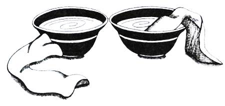 Наполните миску водой и поставьте ее на стол. Положите в миску лоскут ткани так, чтобы половина его свисала на стол, а половина находилась внутри под водой. Подождите минуту-другую и замерьте уровень воды. Ткань и бумага очень быстро впитывают воду, которая начнет подниматься по лоскутку, а затем спускаться вниз по его свисающему краю. Останется ли в