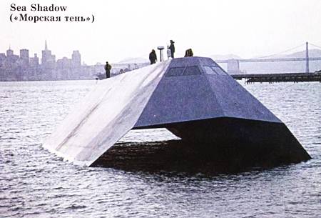 Первенцем был Sea Shadow («Морская тень») — собрат Stealth Flighter («Летающего призрака»). Командование ВМФ США 8 лет тщательно оберегало его от непосвященных в плавучем доке, стоящем на якоре в бухте Сан-Франциско. Но все же 11 апреля 1992 года «невидимка», созданный специалистами фирмы «Локхид», впервые вышел в море днем. И многие увидели, что таинственный корабль представляет собой катамаран, длиной 50 м и шириной 20 м.
